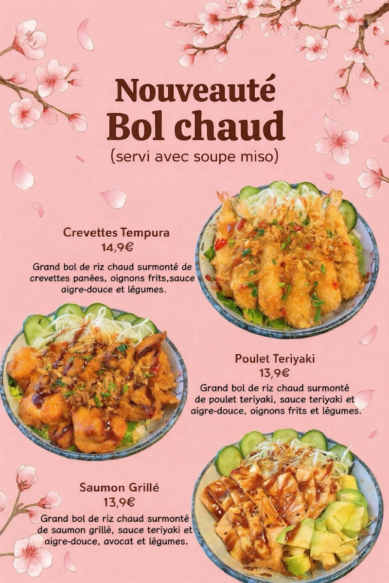 Un bol de riz vinaigré accompagné de poisson cru au choix. * avocat ou cheese supplémentaire 2.50€