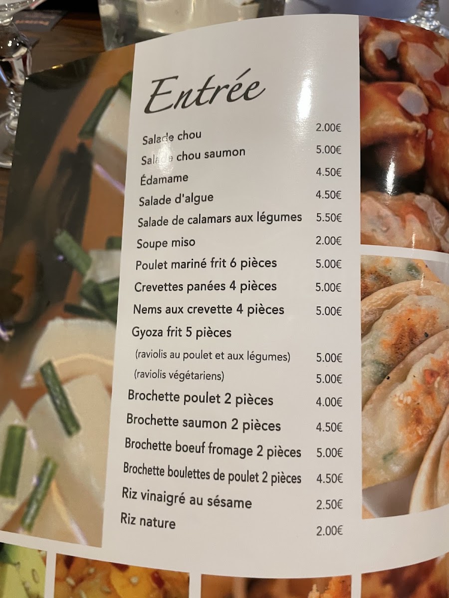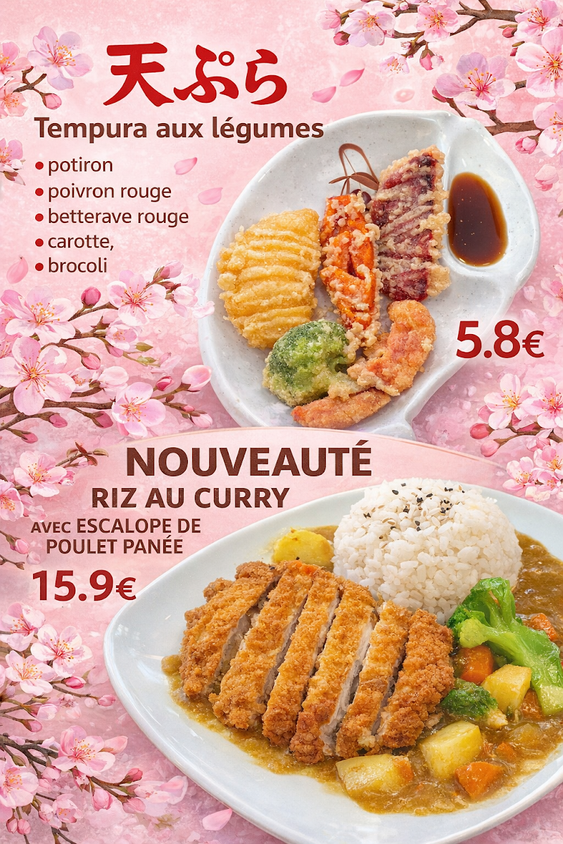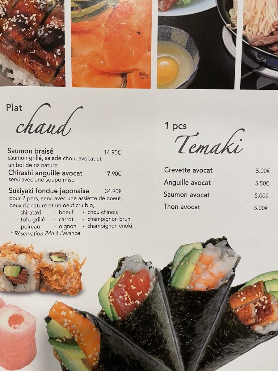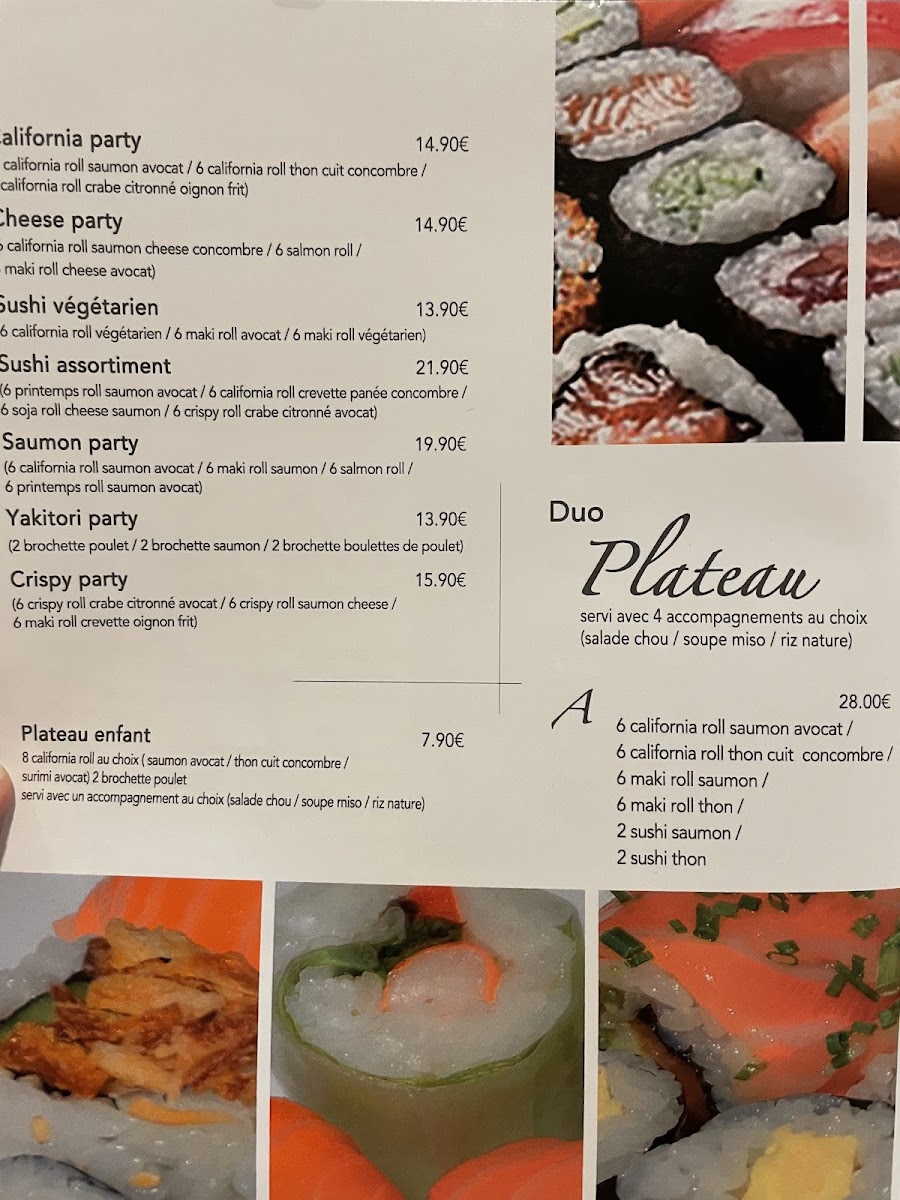 The menu at Sushi Party in Grenoble offers a delightful array of traditional and innovative Japanese dishes. For starters, the Salade chou and Salade chou saumon avocat provide refreshing options, while the Salade d'algue and Salade de calamars aux légumes bring a touch of the sea to the table. The sashimi selection includes Saumon, Thon, and a Mixte Assortiment, perfect for sushi lovers. The rolls are a highlight, with the Dragon roll (8 pieces for €12), featuring crispy shrimp and creamy avocado, and the Tempura roll (10 pieces for €13), combining crunchy shrimp with savory salmon and avocado. For a lighter option, the Soja roll (6 pieces for €9) is filled with a creamy cheese and fresh salmon. The Crispy roll (6 pieces for €10) offers a mix of salmon, avocado, and crab with a zesty lemon touch. For something vibrant, the Rainbow roll (8 pieces for €14) brings together salmon, tuna, and shrimp, along with fresh cucumber and avocado. If you're looking for something unique, try the Printemps roll or the California roll, both priced around €10-12. For a heartier meal, the Chirashi anguille avocat and Sukiyaki fondue japonaise provide satisfying hot dishes. The Temaki (with options like Crevette avocat or Anguille avocat) offer flavorful hand rolls, while the sushi options, such as Sushi Saumon and Sushi Thon, are simple yet delicious. The California party and Sushi party platters are great for sharing, with a variety of flavors in each. Whether you're in the mood for something light and fresh or a more indulgent treat, Sushi Party’s menu caters to all tastes, offering a delicious fusion of flavors at reasonable prices.