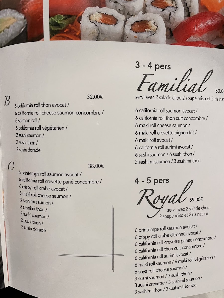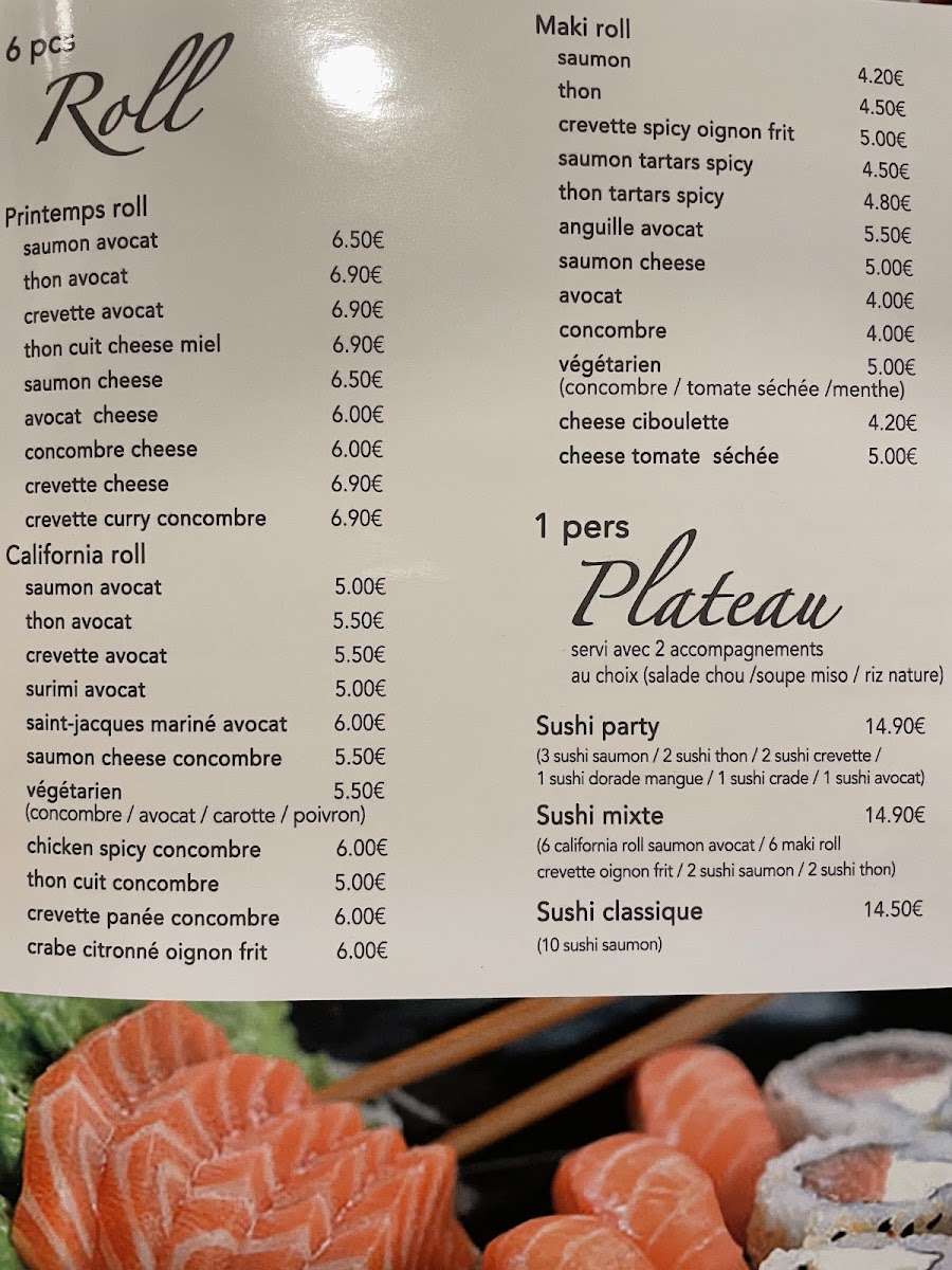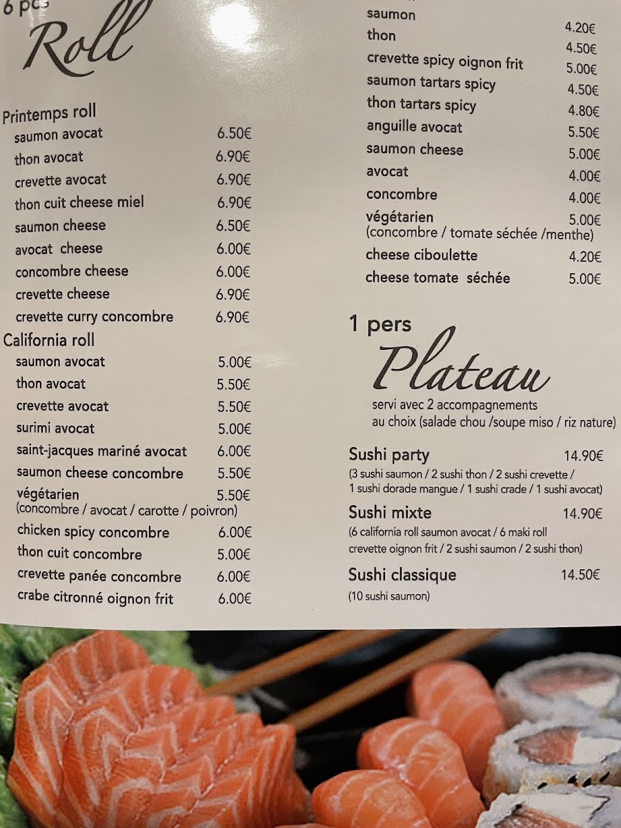 6 Printemps roll Saumon avocat / 6 california roll crevette pané concombre / 6 maki roll Salmon cheese / 6 Crispy roll crabe avocat / 2 sushi saumon / 2 sushi thon /2 sushi dorade/ 3 sashimi saumon/3 sashimi Thon